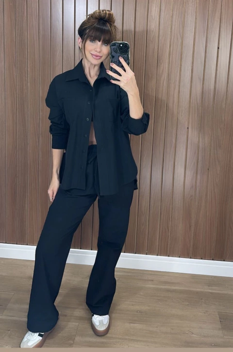 Camisa Janaina (oversize, manga longa, com bolsos e botões frontais) + Calça Cecília (com bolsos traseiros e laterias; amarração frontal e zíper, não tem elástico. Estilo despojada, mais soltinha).