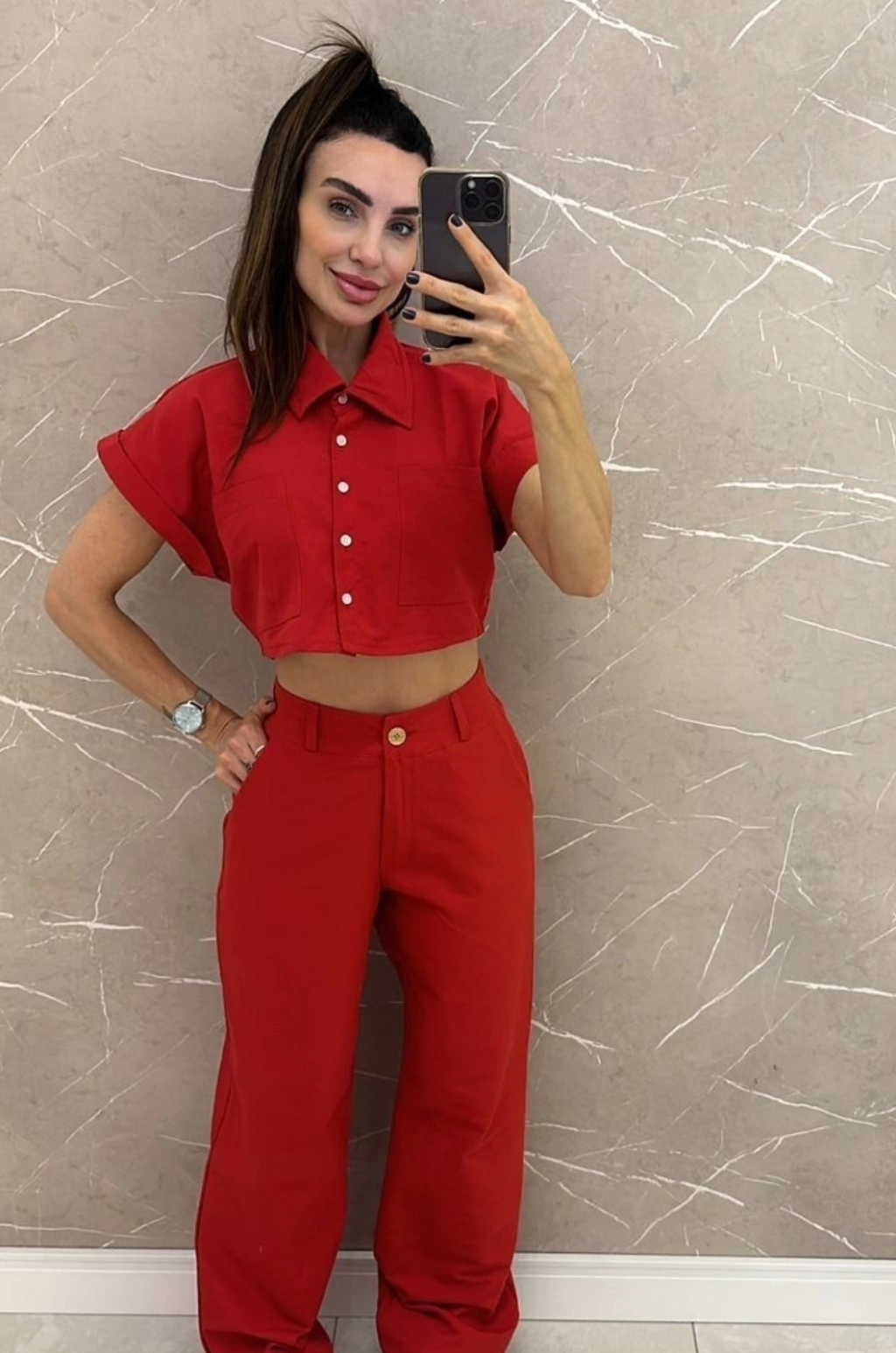 Cropped manga curta, com gola V, bolsos e botões frontais.
