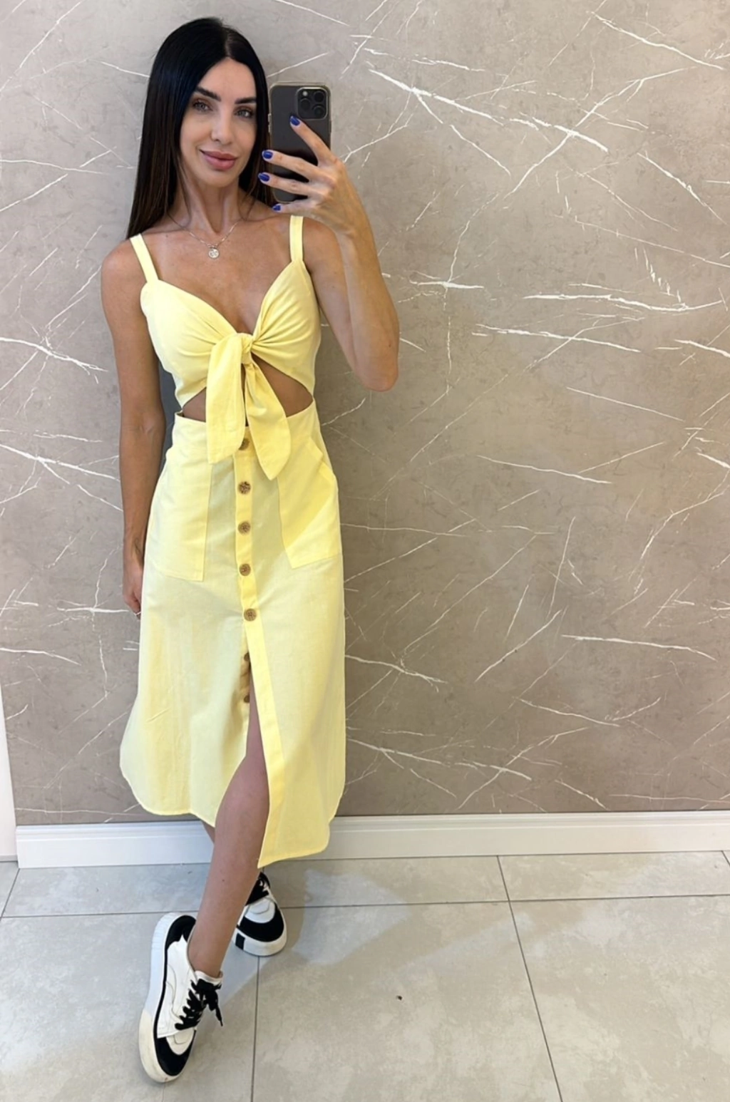 Vestido midi, de alças, com amarração e abertura frontal, bolsos laterais, e sete botões amadeirados na parte da saia.